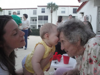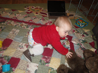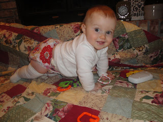 We have been traveling again. We are still not at home, but I have at least arrived in a place where I have my computer and a good WiFi signal, so I’m thrilled to be back online. The start of this trip was a week and a half ago when Miss and I flew to sunny Florida for a family reunion. My hubby joined us the following day. The reunion was fun and I loved seeing so much family. Though the reunion was with my mom’s family, we also got to drive a few hours further south to visit with my dad’s side of the family. My hubby left Florida after the reunion to come to Missouri to hunt for deer, while Miss and I went to Kentucky to spend a week with my parents (who live in the boonies and are technologically challenged, hence the week of no internet). We had a great time in Kentucky. My mom and I had a surprise baby shower for my sister in law, which was so fun. She will be using cloth diapers for my niece, so I had a great time shopping for and giving her some fun cloth diapering stuff. Miss had a big week. She finally truly got the hang of crawling and pulling up, and now thinks she is ready to walk. She tries to push my hands off if I am holding her while she is standing up! She also got three more teeth, doubling the number of little munchers in her little mouth almost overnight.