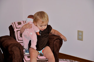And we moved the big glider/recliner from Miss’s room. We also moved Miss’s small wicker rocker from her room so that she can sit and rock with me while I’m nursing or rocking the baby. At least that’s the idea anyway! I still have to get the window treatments done. There is a blackout shade, but I still need to make panels.