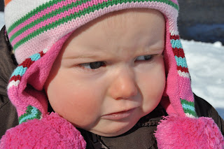 Bundling up. If I were to get a grade for how well I have embraced winter since we moved back to a cold climate, it would be an “F.” I just don’t really love winter. I don’t love cold. There are things I do like about winter, like a roaring fire and drinking hot chocolate. Watching Duke basketball. Christmas. The first few days of fresh beautiful snow that sticks to the trees and makes everything gorgeous outside. As long as I get to look at it from inside. You know, with the roaring fire and hot chocolate. Last winter I was enormously pregnant, and then Miss was definitely too little to go out in the snow when she arrived, so I was off the hook. This winter, I did not buy her a snow suit. She wasn’t walking yet, and I did not think it would be fun for her to go out in the snow and crawl. I thought she was still too little.