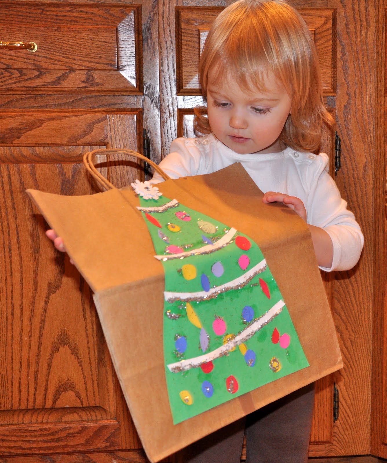 She was quite intrigued buy this idea. She was even more interested when I got out the craft stuff I planned for us to use. I told her we would be making a Christmas tree on the bag and she was so excited.