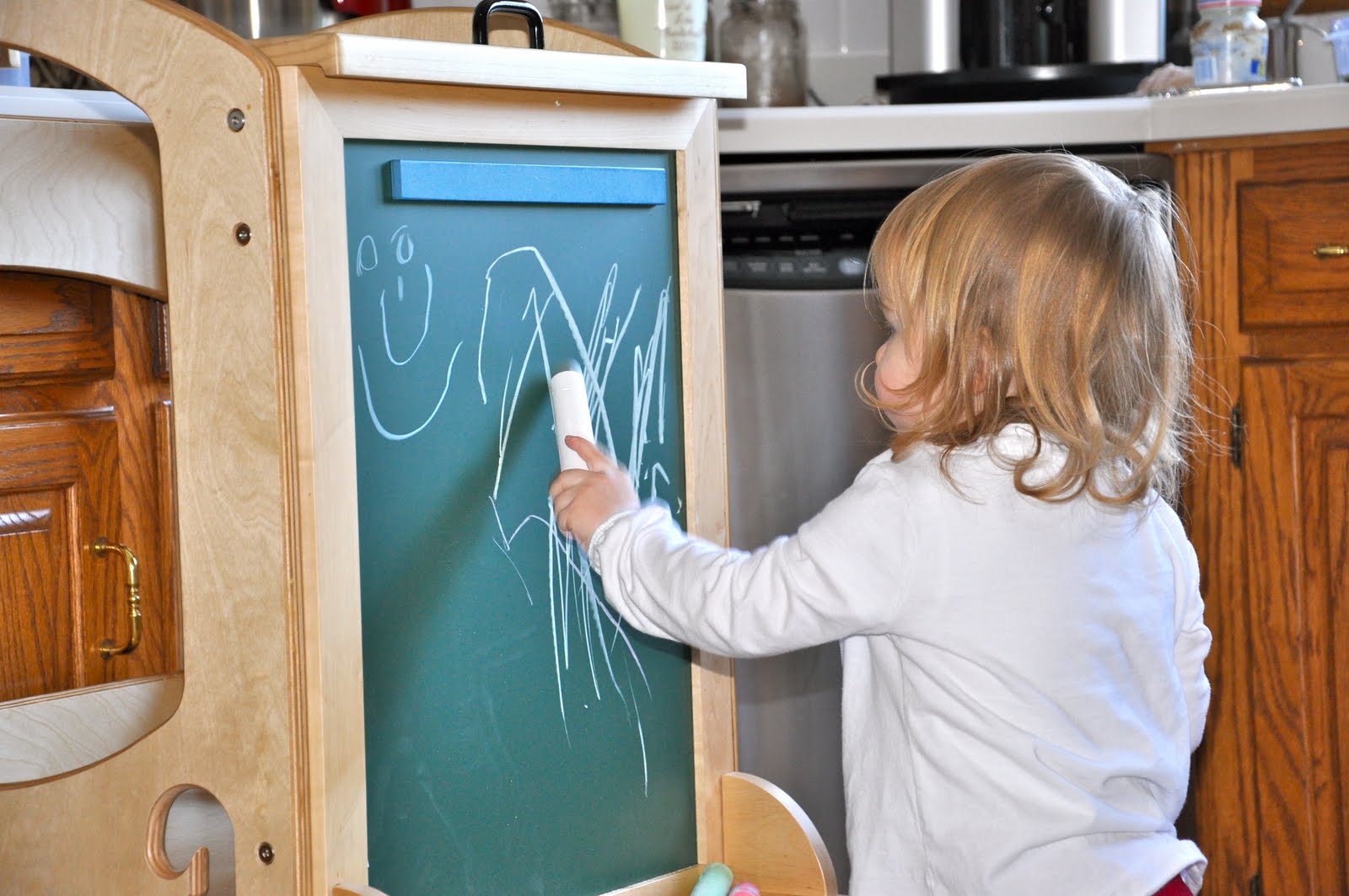 Miss and Lass got an art easel for Christmas that my hubby put together today. It fits right onto her Learning Tower and had a chalkboard side and a dry erase side, as well as a magnet to hold a piece of paper in place.
