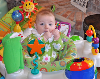 I knew those out-dated books from graduate school would come in handy some day. Actually, since she’s in the 90th %ile for height, she’s pretty much tall enough to reach the base of the exersaucer, so she doesn’t really need the book there at this point, but I keep it there just to give her a little extra to “stand” on.