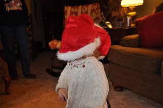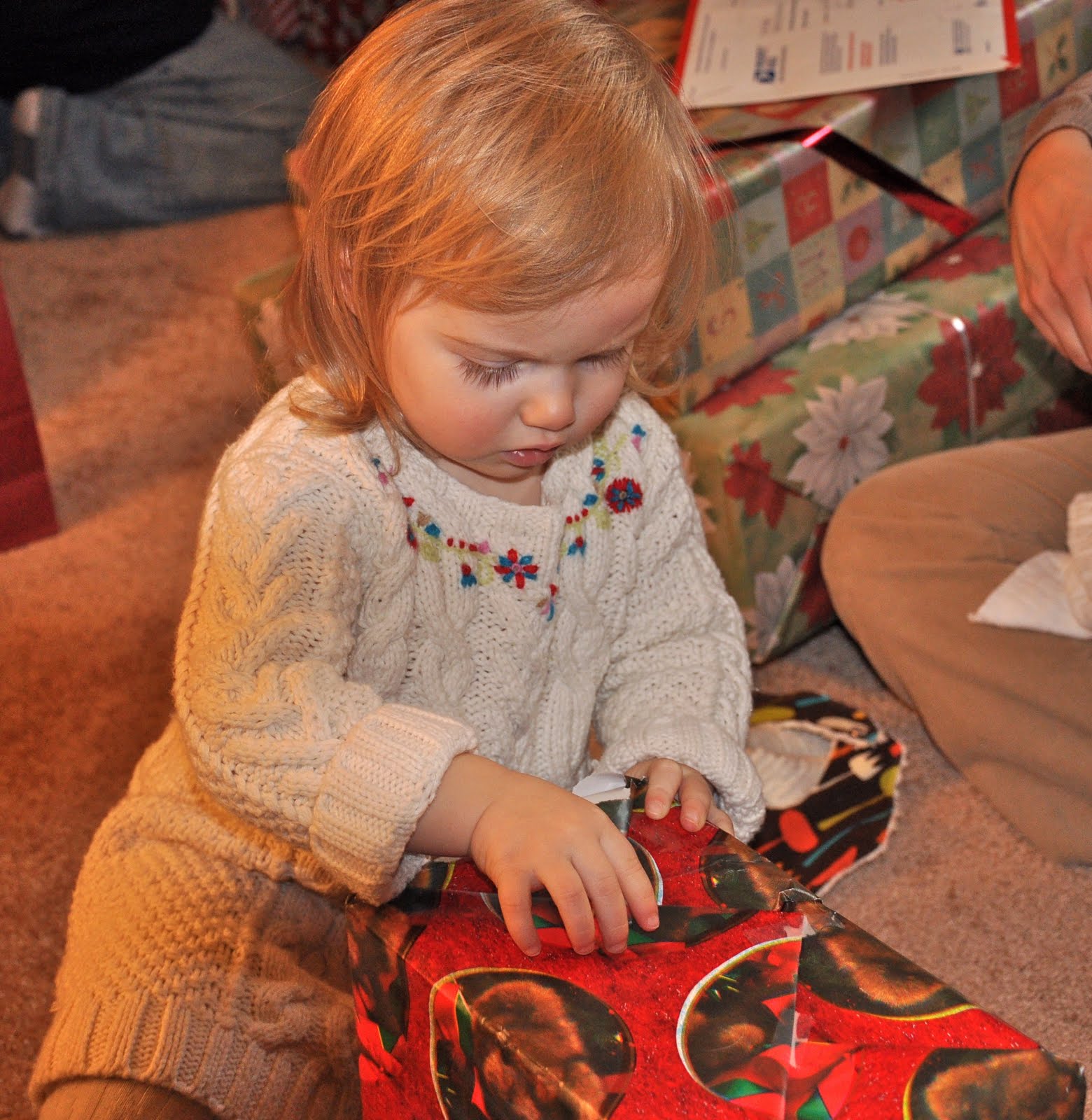 Then we went in to the Christmas tree, where Santa had left gifts for her and Lass. I really expected her to be so excited and dig right in to the toys and books. Instead, she stood and just looked puzzled for a little bit.