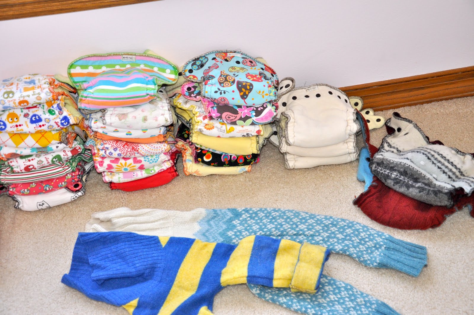 My very favorite cloth diapers ever will soon no longer be produced. After today, new Nifty Nappy diapers can no longer be ordered. This makes me sad. My love of Nifty Nappies started out a little over a year ago with one Nifty Nappy, two Woolie Wraps (wool diaper covers made from upcycled sweaters) and two pairs of wool longies (wool pants made from upcycled sweaters). You can see that my stash has grown (the photo below shows most of my Nifty Nappy items, but there are a few not pictured because of being in the laundry).