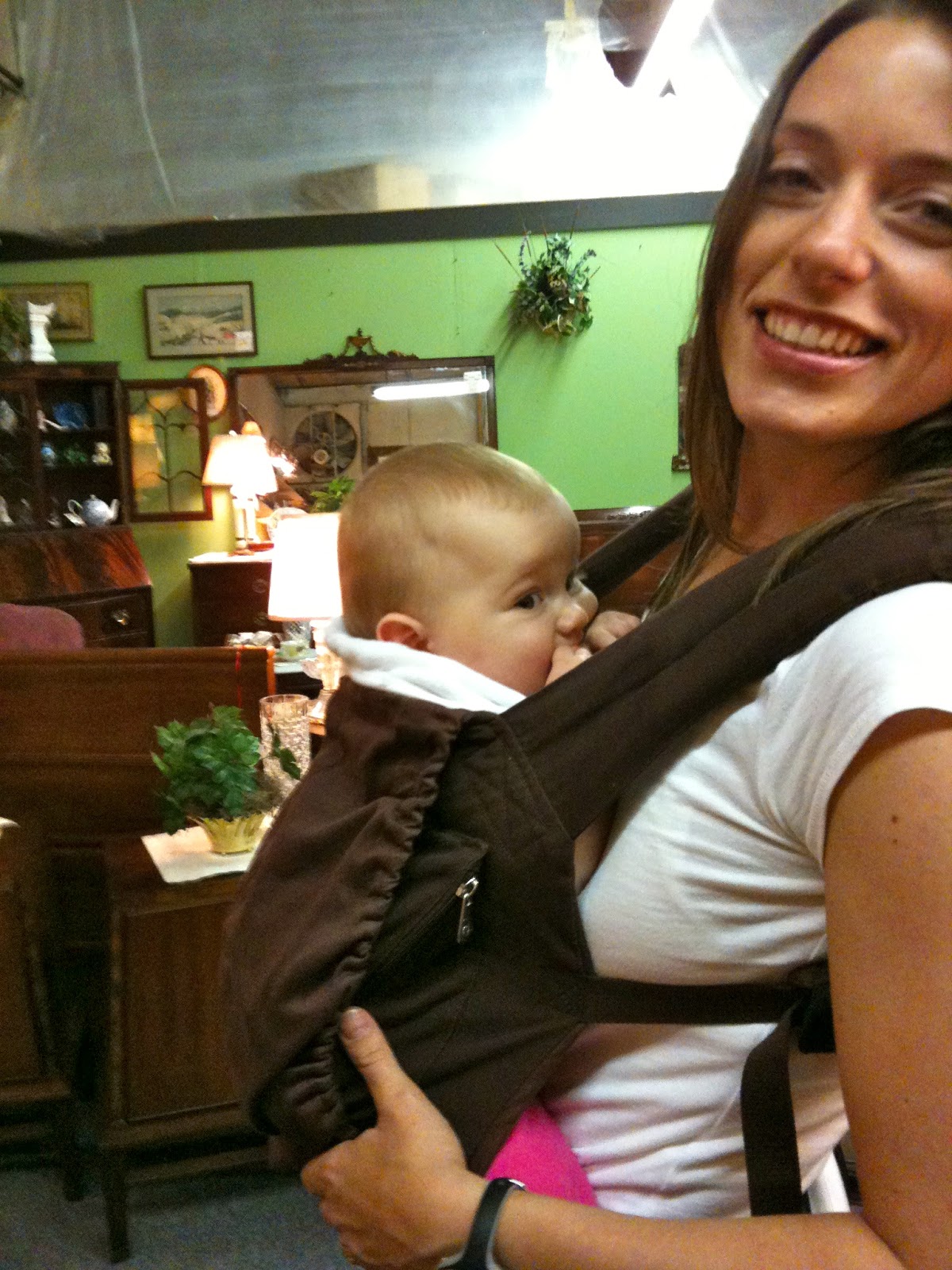 And my favorite carrier of all time is the Ergo. I love my Ergo. It is so comfortable, even when worn for hours, like when Miss went on her first antiquing expedition with my mom and me.