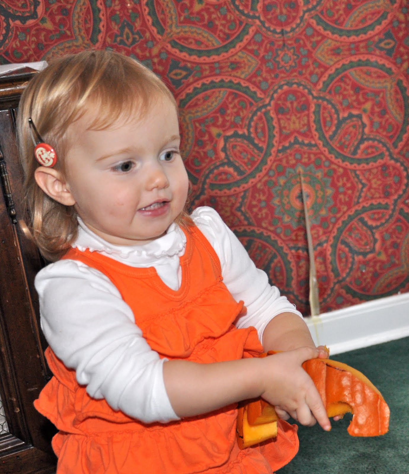 We played outside this afternoon. The weather was perfect and Miss had a great time in the yard as always. Lass hung out in my BabyEtte wrap again. Bubbles were blown, sticks were collected (and crab apples, and acorns. . .), and there was lots of happy running.
