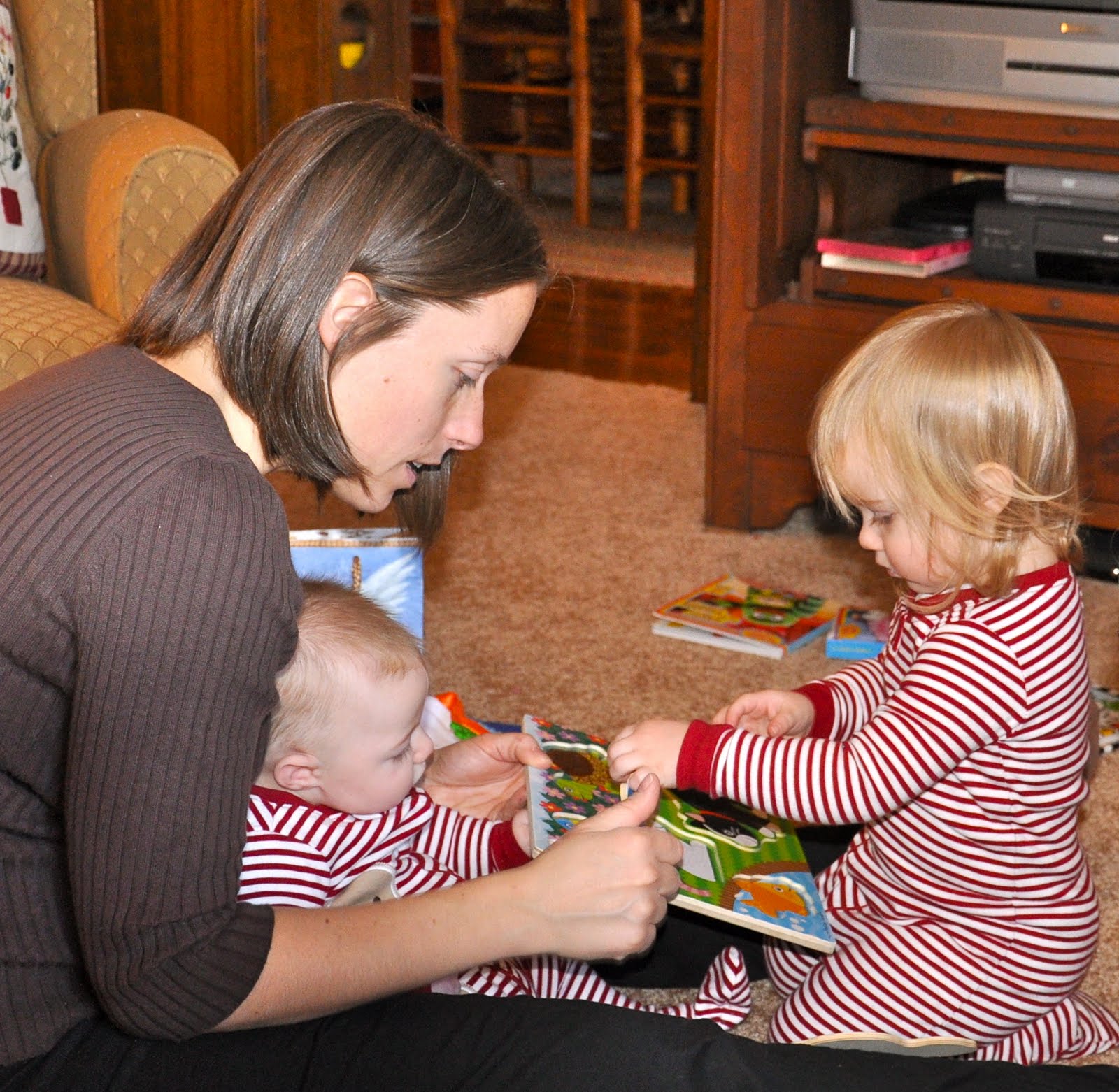 We got to my Grandma B’s house last night. My parents are also here visiting my Grandma (and my mom was at my Grandpa’s when we got there yesterday). Today Miss had a big day playing with family. My mom, ever the children’s librarian, has held storytime several times today.