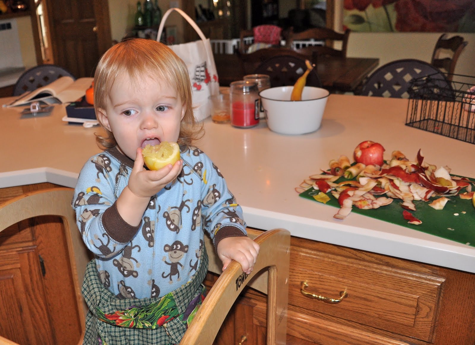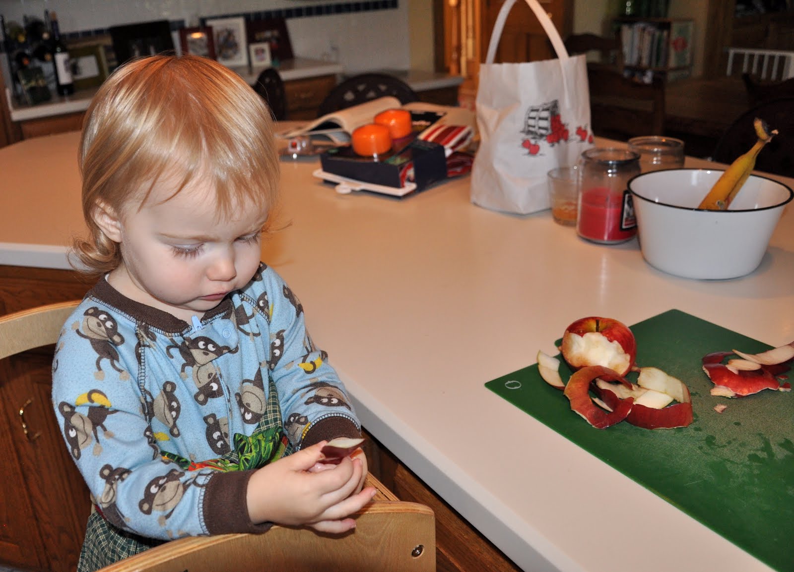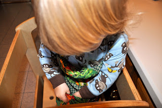 Hanging out with Lass at lunch time. We had no more eating-related meltdowns. She had forgotten entirely about the sandwich. For lunch she wanted strawberry yogurt and Cheerios. Unfortunately I had eaten the last strawberry yogurt while she was howling face down on the floor, but she was content with apple. And I wasn’t gonna fuss about the lunch menu today. Apple yogurt and dry Cheerios? Sure.