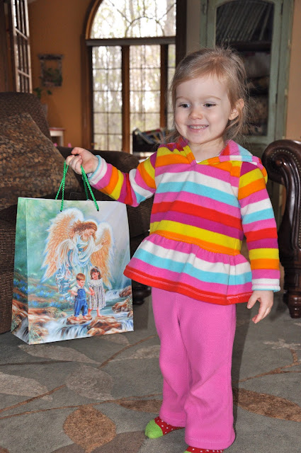 The day of the story time was also my husband’s birthday. This year I let Miss pick out a few presents for him in addition to what I got for him. A couple of weeks ago I took her to the dollar store (the real one where everything costs $1), gave her a $5 bill and told her she could pick five things that she thought her Daddy would like for his birthday. She walked around the store clutching the $5 bill in her hand, selecting things at her eye level. It was so fun to watch her make her choices and then to pack them up when we got them home. In addition to the five presents, she was also allowed to pick a card and a gift bag for him.