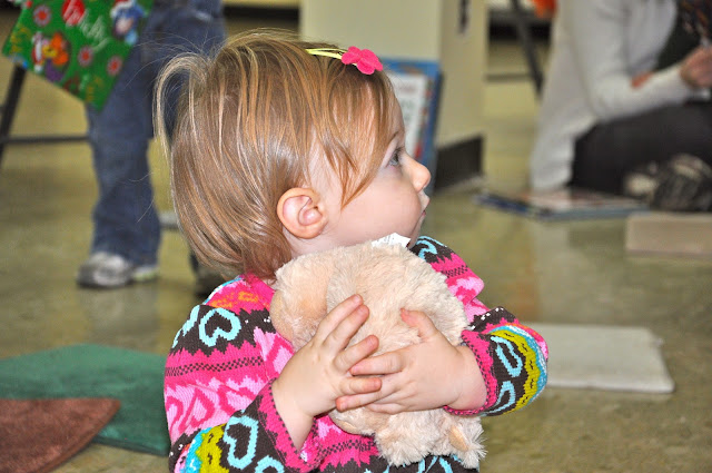 We did stop upstairs to check out some books, which Miss had fun reading to her baby doll when we got back to my parents’ house.