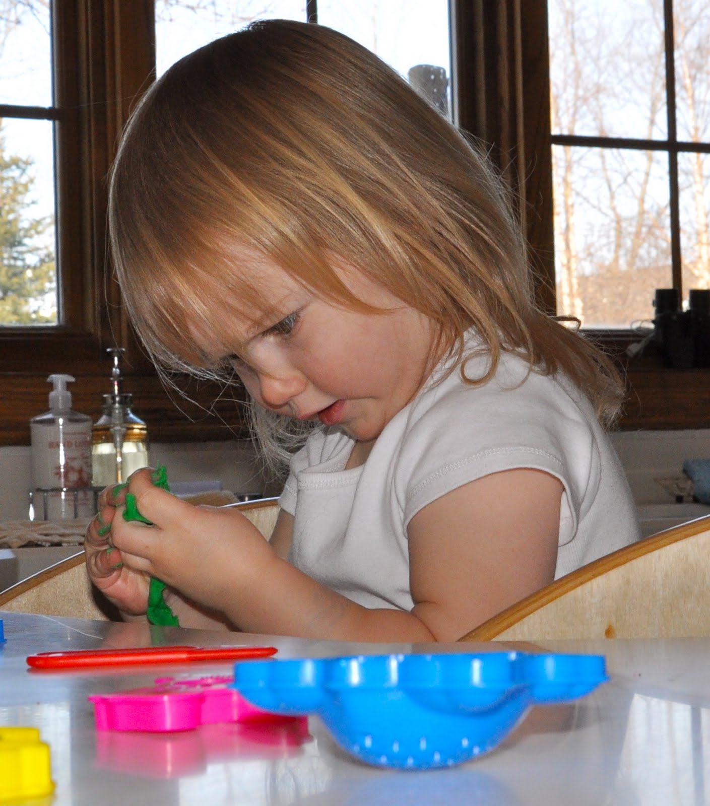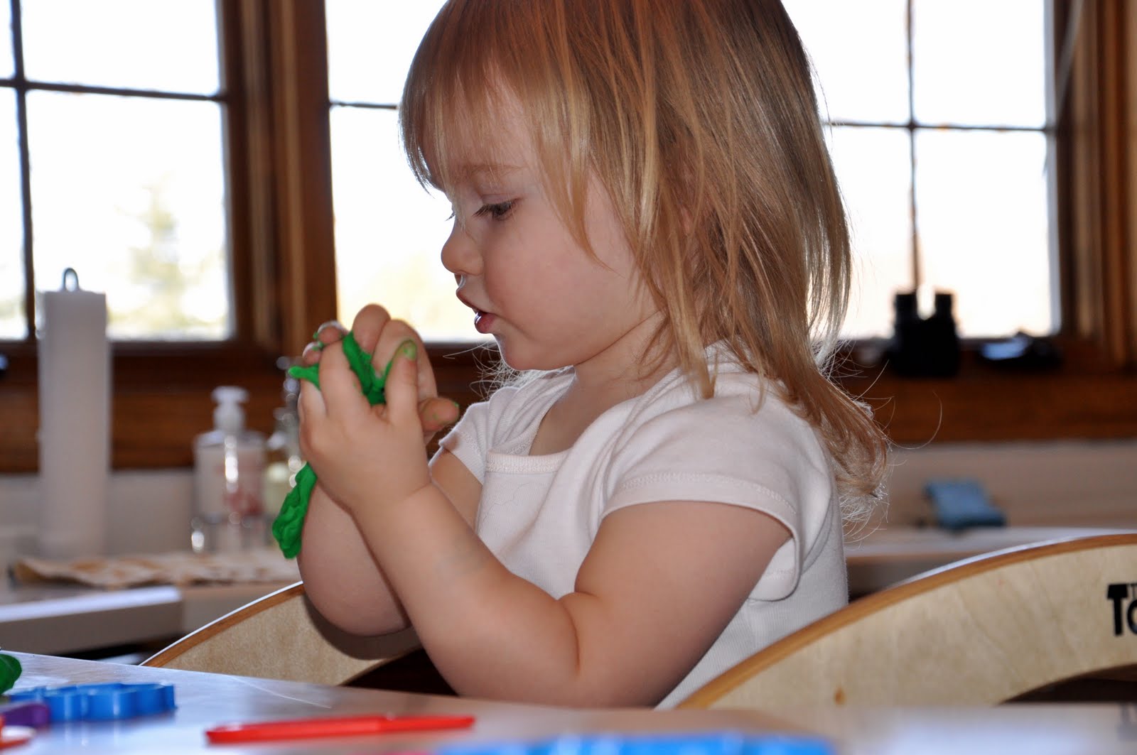 Of course anything that she can manipulate with her hands is fun. Play-Doh squishing is a joy for her.