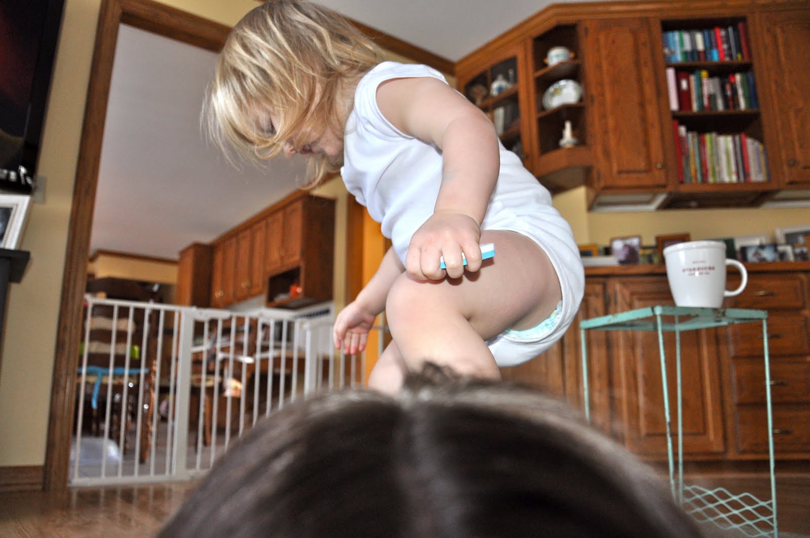 After she mastered balancing on my back, she thought it was very funny to jump up, straddle my back, and drop down on her rear end onto me. Yeah. Ha. Ha.