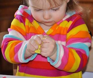 Of course the most fun of all with play dough is smooshing it through your fingers. It was quite fun to watch her squeezing it as hard as she could saying, “Squish it!” and “Squeeeeze!” Funny girl.