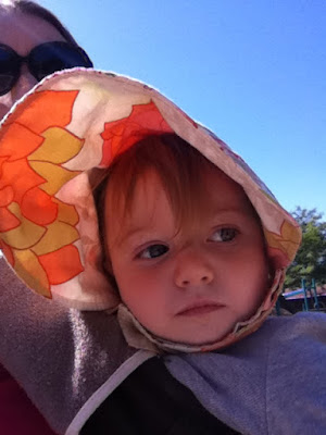 Today the weather was perfect. A beautiful late summer, early fall day with sun and a breeze and a temp of about 75. I decided it was a park day. Lass loves hats, and was so excited when I pulled out her bonnet for the park trip.