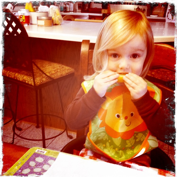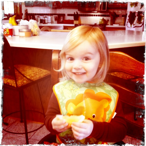 An example of this occurred in the grocery store checkout the other day. We were waiting for the bagger to get the last of our stuff in the cart. Miss said she was hungry and I told her that we were going to go home in a few minutes to have lunch. I then asked her what she might like to eat. Without skipping a beat she replied, “A lemon.” She was so serious about this I couldn’t help but laugh out loud. And she continued to ask for a lemon to eat, all the way home, during lunch, and the next day. I kept telling her that I needed to use the lemon we had purchased that day for a recipe, but she kept asking. Today when it was time for her snack I suggested apple yogurt. She said, “No, I fink my want a lemon.” I had realized, when cooking my recipe that required a lemon last night, that I actually had another, extra lemon in the fridge, so this time I said, “Sure. Hop up to the table and you can have a lemon for your snack.” I was chuckling to myself about this, but she surprised me. She took several bites and kept asking for more.