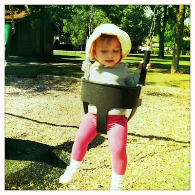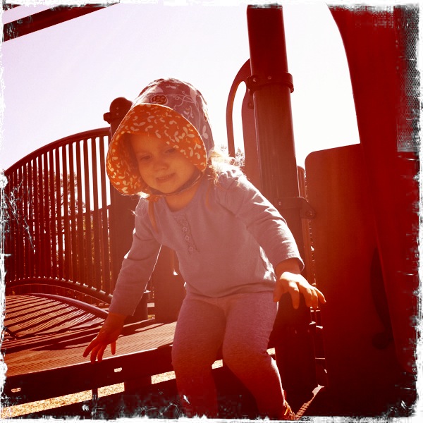 Today the weather was perfect. A beautiful late summer, early fall day with sun and a breeze and a temp of about 75. I decided it was a park day. Lass loves hats, and was so excited when I pulled out her bonnet for the park trip.