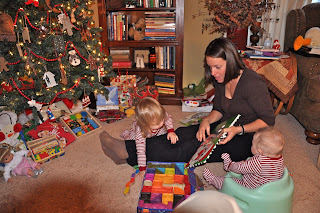 Then we went in to the Christmas tree, where Santa had left gifts for her and Lass. I really expected her to be so excited and dig right in to the toys and books. Instead, she stood and just looked puzzled for a little bit.