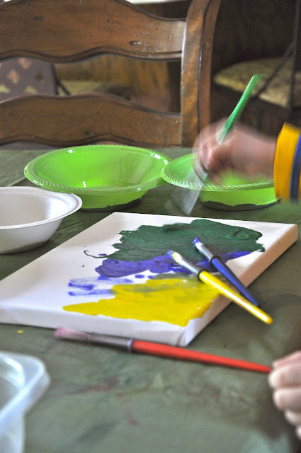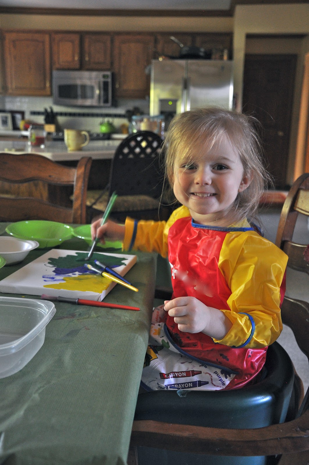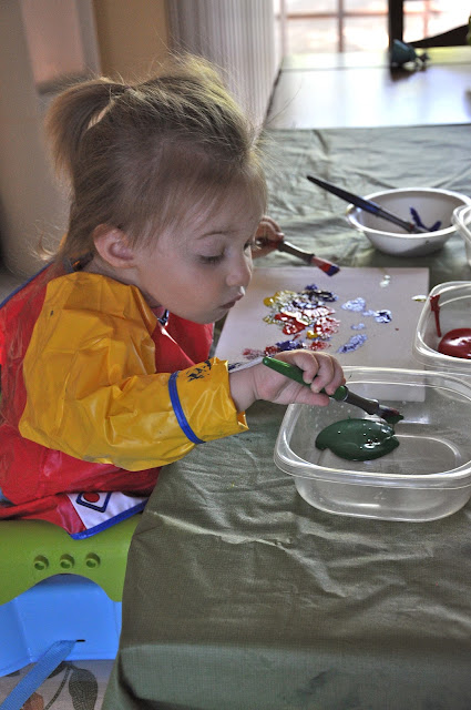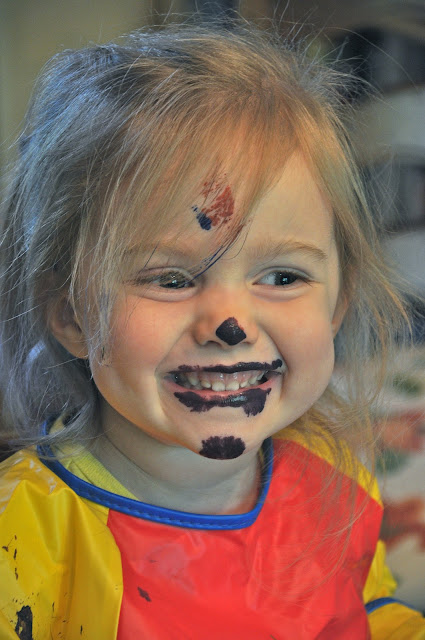 Then Miss did paintings on paper for my Grandpa, my Dad, and my Father-in-law (Lass lost interest after her canvas was done).  At the end as she was finishing up the painting for my Father-in-law, her Papa, she decided it would be funny to stick her face in the still-wet paint.