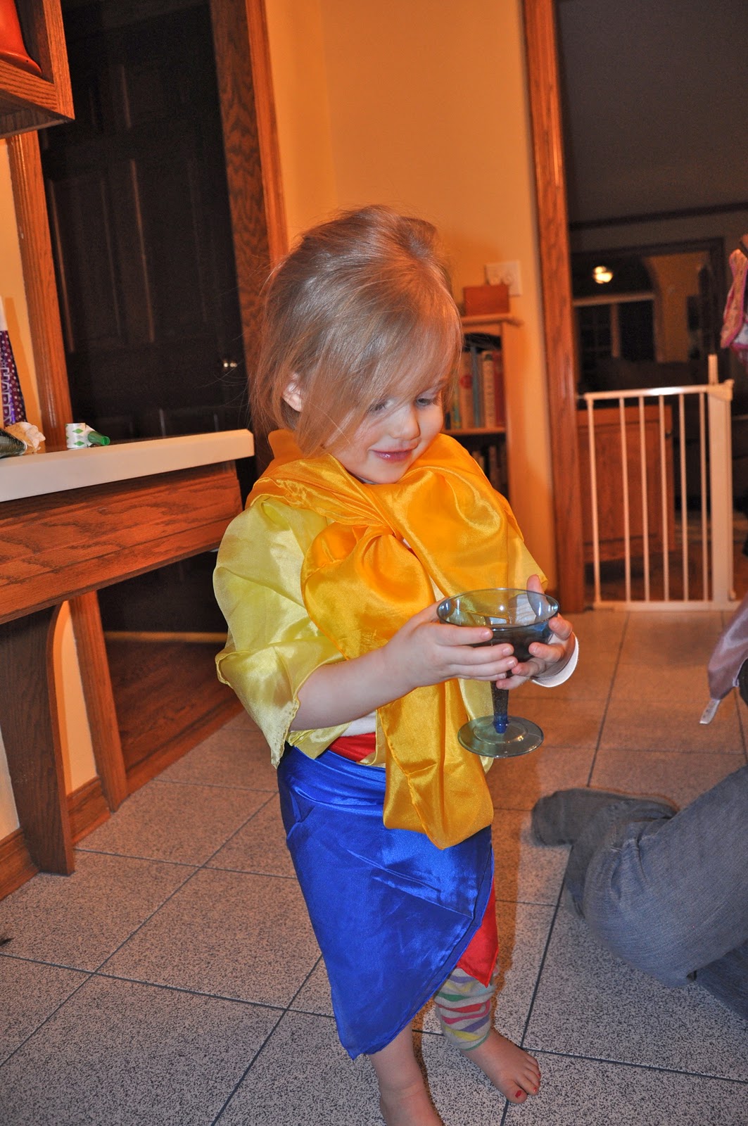But my girl is nothing if not loyal. The old Cinderella, whose dress is totally missing its skirt now, is still ever present in her left hand.