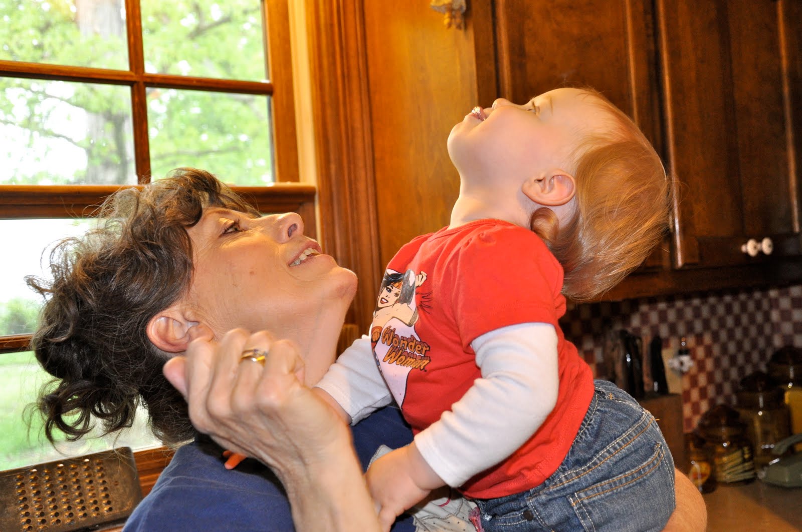 Being silly with Grandma. Grandma taught her to make a clock sound and be an elephant (Miss raises her arm like a trunk, but doesn’t do the noise very often). I have no idea what they’re doing here. . .
