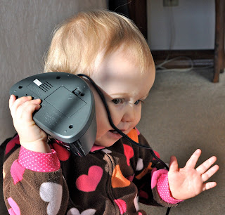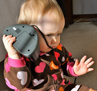 Miss loves to talk on the phone. Rather, she loves to pretend to talk on the phone. When I put the phone up to her ear with another person really on the line, like my mom, she gets all wide-eyed and clams up! But when there’s no one on the other end, she loves to have pretend phone conversations, whether it’s with the real phone, one of her toy phones, or something that sort of resembles a phone, like the alarm clock in our guest bedroom. Don’t be alarmed (sorry, couldn’t resist!), it’s unplugged.
