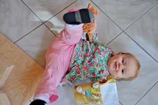 She loves to try to help with chores like laundry and dishes. Often this means throwing the clean clothes out of the laundry basket, taking off with an article of clothing she finds to be particularly fun (usually an undergarment of some sort!), putting shoes into a laundry basket, or unloading the clean spoons from the dishwasher onto the floor. But she does follow simple directions pretty well so sometimes she is actually helpful. She loves to play in closets with clothes and shoes (wonder where she gets that??) and I love watching her take clothing and try to put it on over her head. Sometimes she’s even somewhat successful!