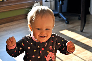 Miss is 13 months old today! It amazes me how quickly she is changing and learning new things. I have already told you a lot about what she’s up to these days. She’s walking everywhere, climbing the stairs like it’s the most fun new game, etc. She is ornery and silly and does the funniest things that keep me laughing all day. But she is also very thoughtful and loves to sit and study new things that she sees. She loves to read her books. She’s very good at entertaining herself, but also loves to play and be silly with her Momma and Daddy.
