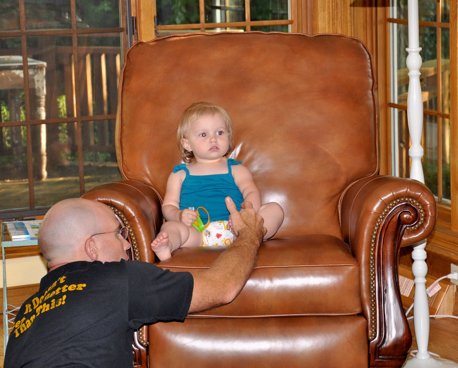 And the new couch is wonderfully comfortable and should last forever. I got what I think is a pretty long-wearing upholstery (I had small children and black dogs in mind when I picked it) in neutral colors, so this will be our couch for many many years to come. Interestingly, the upholstery I picked kind of reminds me of the fabric that was on the couch my parents had in our house when I was growing up. I didn’t realize it when I picked it. Didn’t realize it actually until just now. That couch lasted a long time, so hopefully I made a good choice. Unfortunately the rug we have had in the family room doesn’t really work with the new stuff, so it will move into the sunroom, where we need a rug anyway, and I am looking for a new rug for the family room. You may notice the dark brown, kind of grungy looking cushions under my hubby in the photo below. Those are the cushions I’ve been keeping piled on the floor for propping my butt up to get Baby Girl to turn!