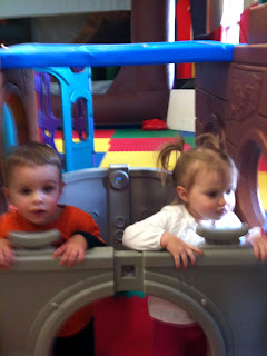 We had a fun play date today at a place called Wild Air. It’s one of those indoor play places with the inflatable things for the kids to bounce and slide on. I was so excited that Miss would love it, since one of her favorite things about her gymnastics class is bouncing on the trampolines. Unfortunately, the noise of the fans constantly blowing air into the inflatables kind of freaked her out to start, and she refused to go into any of them. Instead she played with some of the other random toys they had around.