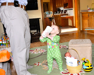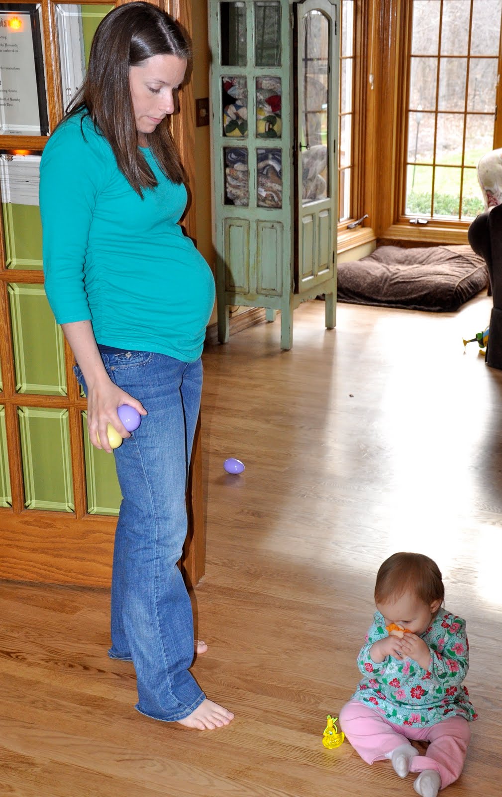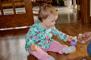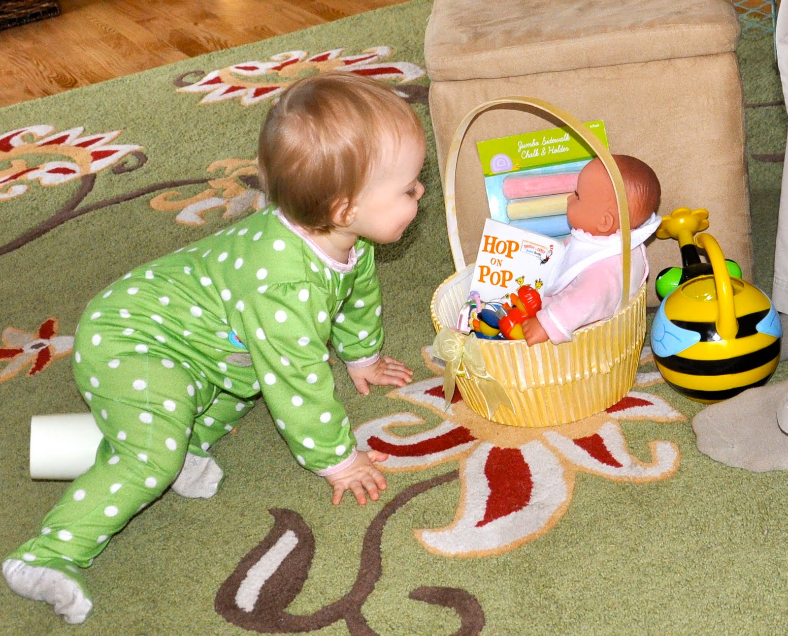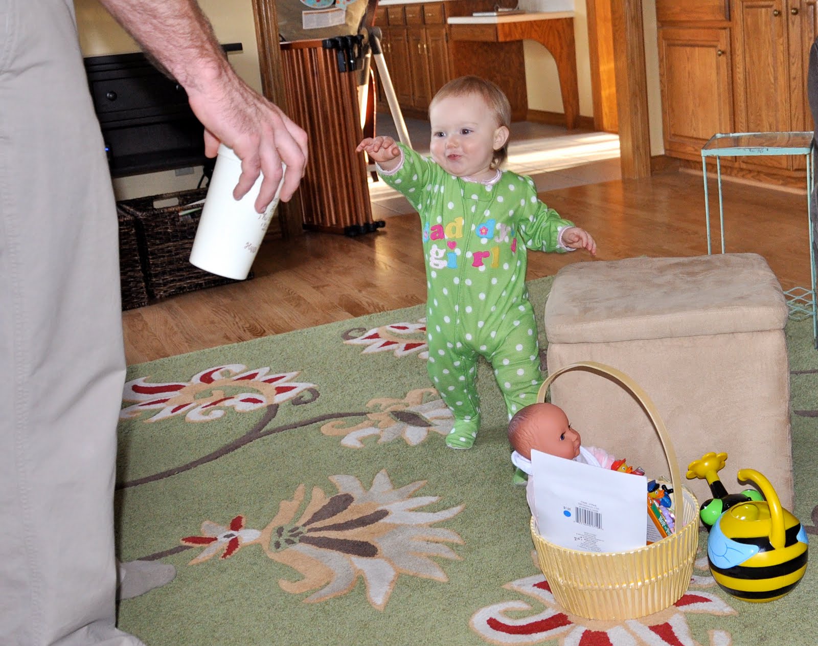 After my hubby got home we did the Easter egg “hunt.” You can see Miss enjoying the small finger puppet she got from one of the eggs. The last egg is on the floor in the background. I actually had hidden it by the side of a bookcase, but it rolled out the the middle of the floor. I made it easy, but not that easy! Miss didn’t fully understand the hunting part and needed some help, but she had fun when she did find the eggs and get the treasures from the middle.