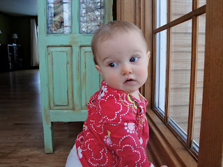 Miss is stepping!! Little adorable steps, sometimes up to about 8 strung together, but the steps are so tiny she doesn’t usually move very far. I wouldn’t really say that she’s walking yet. She still prefers crawling and cruising the furniture, though her cruising has gotten more daring. Still it was so exciting to see those first steps the other night!!! And every time she takes more steps, she looks so excited and proud, I just love it. Also, tonight she stood up without pulling or pushing up on anything. She just popped right up and was standing in the middle of the floor with this big grin on her face. I can’t believe how quickly she’s learning new things. I know she’ll be running all over the place if I so much as blink!